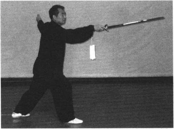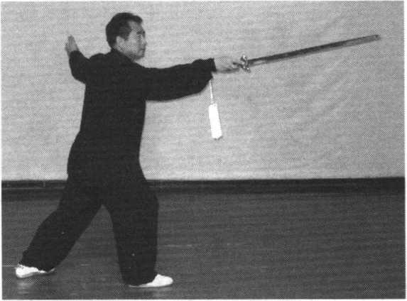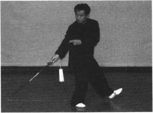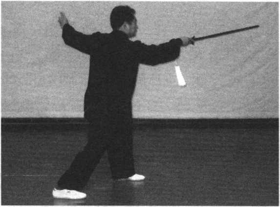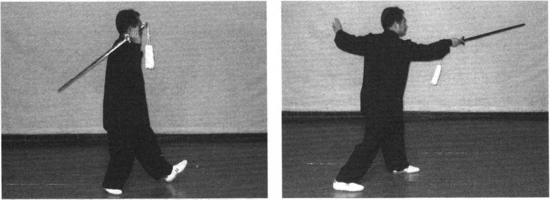右脚前上一步,脚尖翘起,右手剑向左后下扫。手心向上,剑 尖低于膝,剑指合于右腕处,胸朝北,眼随剑动。(图147)
