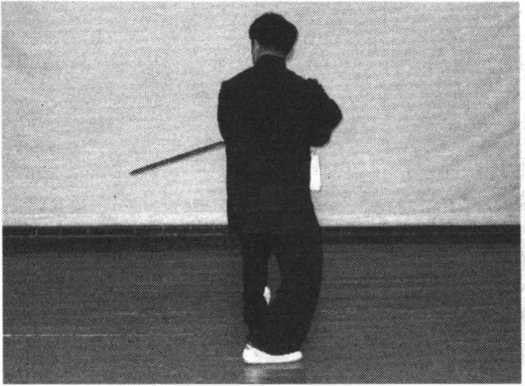 身微左转,提起左膝,右手 剑由上向左后下扫,胸转北,剑 指合于右腕处,眼随剑动。(图 149)