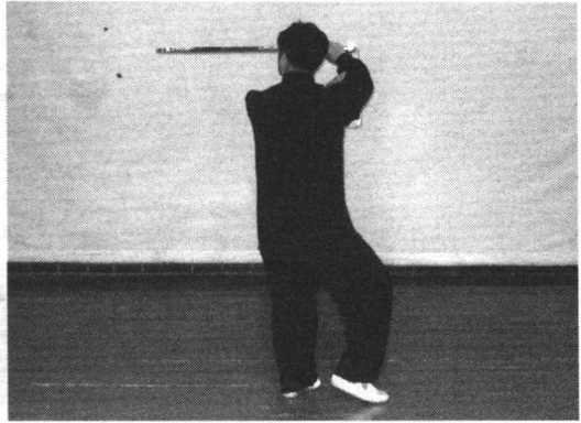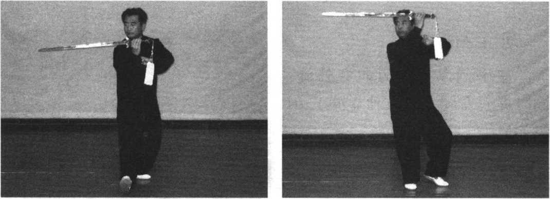 身向右转,弓右腿,右手剑向前(东南)抡劈。剑指划于左上 方,眼看剑。0148)