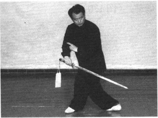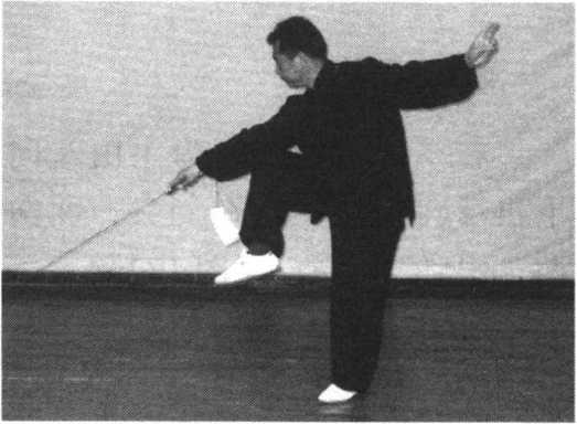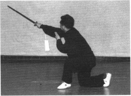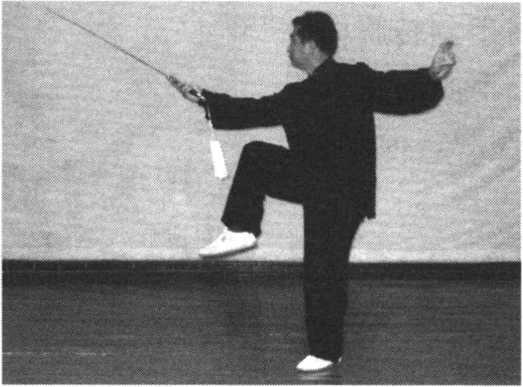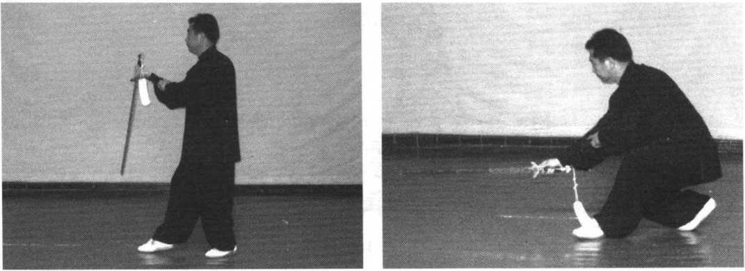 接上式,右手握剑,内扣左 脚,身向右转。右手剑向下截 扫,同时提起右腿,左剑指分于 左上方(胸向西南,剑下扫正 西),上身微前俯,眼随剑动。 (图 169)