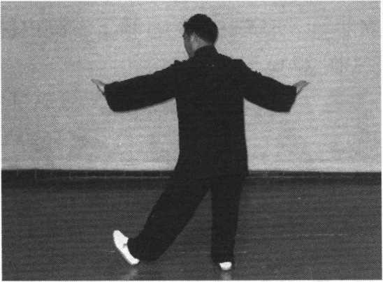 左脚自后向前上弧形里摆,同时两臂左右分 开,掌心均朝后,左掌迎击左脚内侧(正东),身体继续右转180。, 此时右掌划至正东,接着左脚下落,脚跟着地,胸部朝北。(图226 -228)