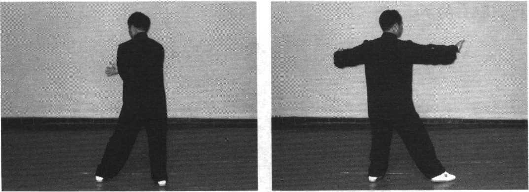 6.左脚内扣,身体右后转,中心移向左腿,胸朝北。随转体同 时,两手由两侧交叉合于腹前。随即两手分开与肩平,掌心向下, 右脚掌自然内转脚根放松,胸朝北。(图229 -230)
