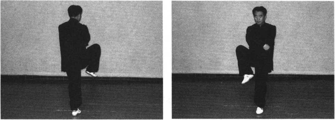 1.两手在腹前相合,右腿提膝,脚尖自然下垂。(图231)