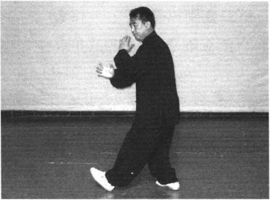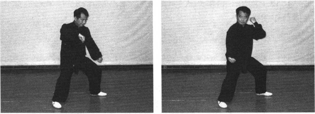 1.接上式。右掌屈肘变拳下落于右膝上方,拳心向上,同时左 掌变拳屈肘拳与眼平,拳心朝里。两拳上下要合住劲,胯要松,裆 要圆,形成马步,气下沉。胸朝东,眼看左拳。(图44-45)