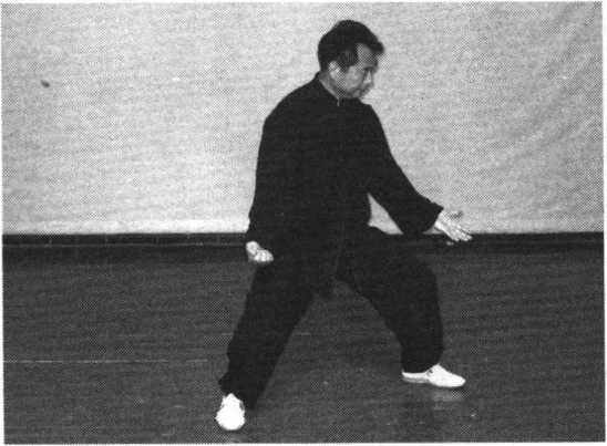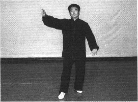 左脚内扣,重心左移,右掌上起立掌右划,同时身向右转180度, 右脚掌同时外划,左手落在左胯旁,胸朝南,眼向前看。(图48)
