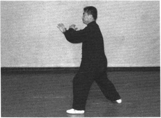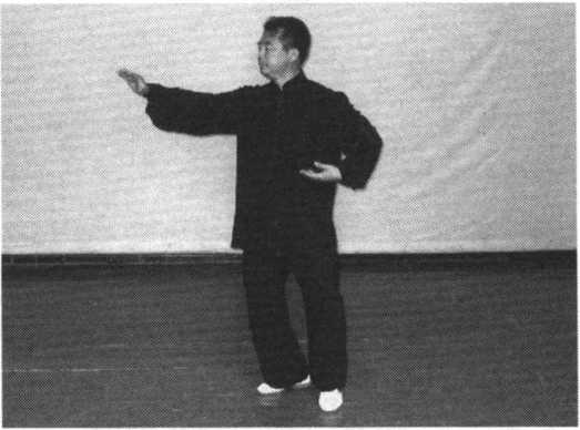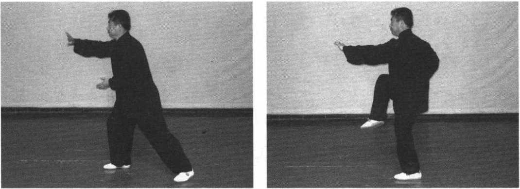 2.重心移换左腿,提起右腿,身微右转,同时右转臂下划经左 掌下收至右腰间,掌心朝上。左掌转臂经右掌上前推,肘微曲,掌 心向下,胸朝西,眼看左掌。(图88)