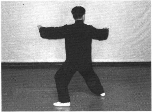 L高探马之后,左下右上转臂,左掌转臂收至胸前,右掌转臂 上划至右侧方,同时震右脚落地为实。左脚随之向左侧横开一步 (西南)。左侧弓步,胸朝西,眼看两掌。(图89 -90)