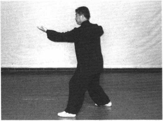2.重心向左移,右脚向左脚后叉步落脚掌,同时转臂左上右下, 左掌经面前划至左侧方,右掌下划至腹前,掌心均朝前,胸朝西, 眼看两掌。(图91 -92)