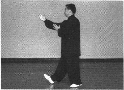 1 .向前弓腿,成右弓步,同时右手翻掌向内,指尖斜向上向左, 与眼平。左手按于右手腕处前挤。(图8)