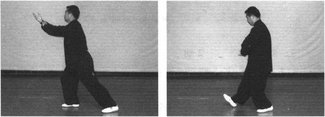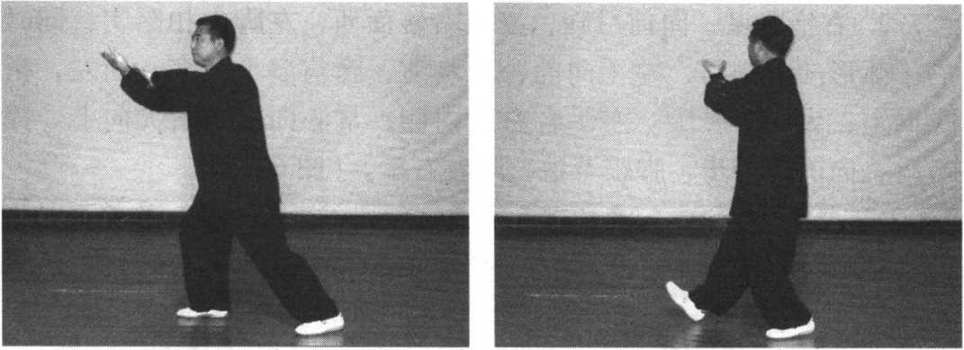 2.右抱七星,向前弓腿,身向右转面西,左脚内扣踏实,同时 右手弧形向前推挤,左手向前合于胸前,腕与肩平,掌心向左,指 尖向上,大指对鼻尖。左手合右肘内侧,掌心向右,指尖向上。提 右脚,向前迈半步,脚跟着地,眼看右手。(图6-7)