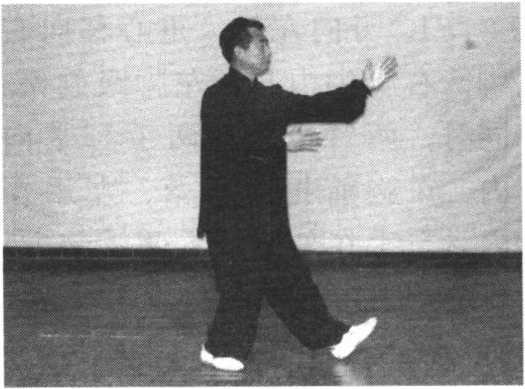 1.重心后移,身微向右转, 左手向前上划弧至胸前,成侧立 掌,右手向后划弧至左肘内侧, 两手有相合之意。身微左转,面 向正东,左脚脚跟着地。眼看左 手前方。(图28) '