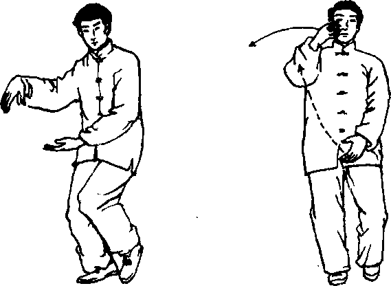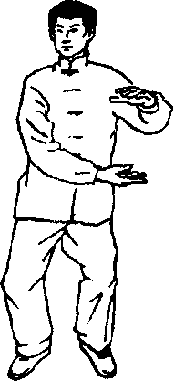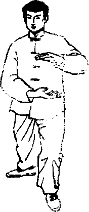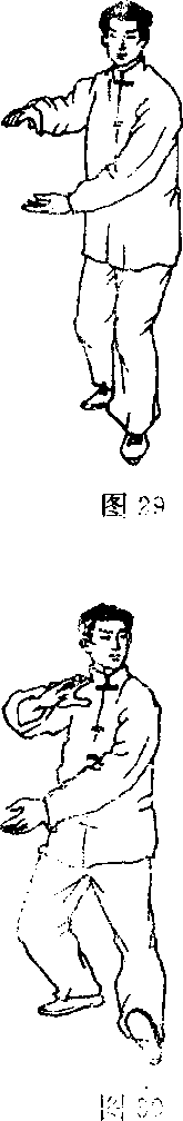 1. 右脚尖稍外撇,同时身体微右转重心在右腿; 右臂上抬屈于右胸前,手心向下;左手翻转向右划弧 至右腹前,手心向上,与右手相对形抱球状,左脚收 至右脚内侧,脚尖点地;目视右手(图29)。