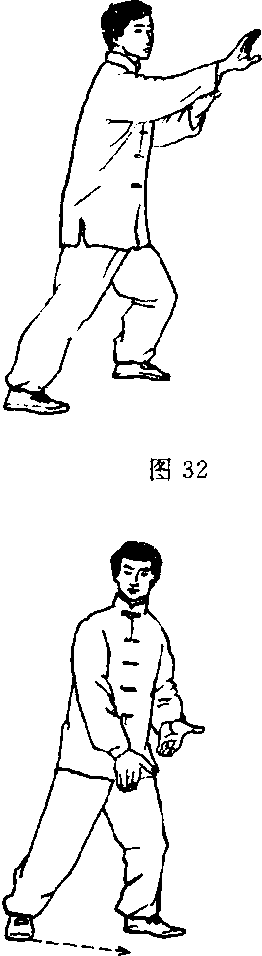 4. 接上动,左弓步双手(左 上右下)抱球向右侧后划弧;身 体随双手划弧微问右转;目视双 手(图32)O