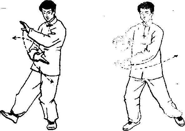 上左下)抱球;右腿成弓步’双手由右向左侧后划弧;