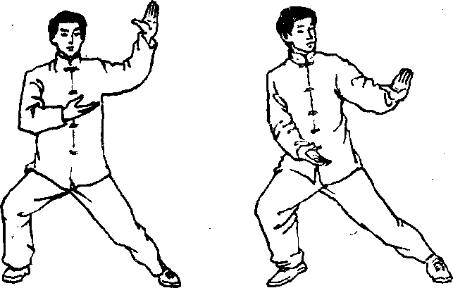 9. 身体重心前移至右腿,随即双手变掌,双掌