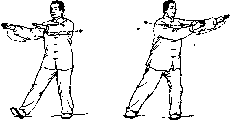 心逐渐移至左腿;左手由面前随转体向左运转,至少 体左侧?手心翻转向左下;右手经腹前向左上划弧至 左肩前,手心斜向后;右脚移近左脚」相距10至20