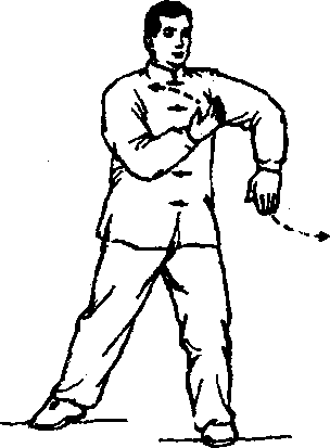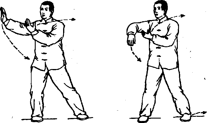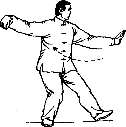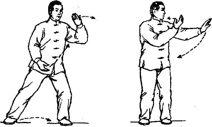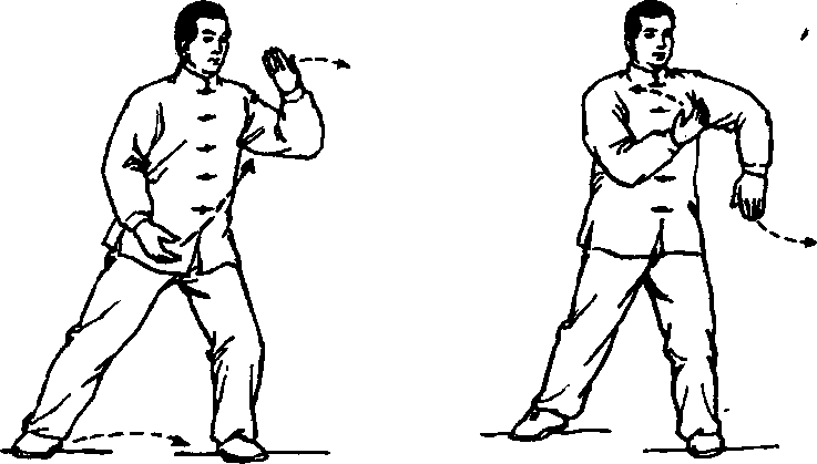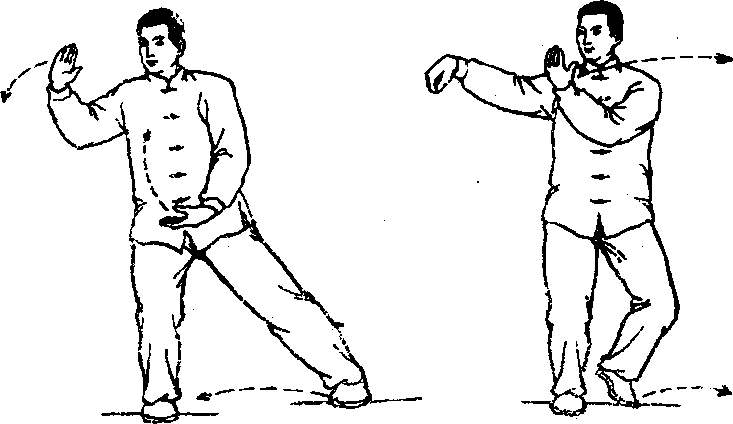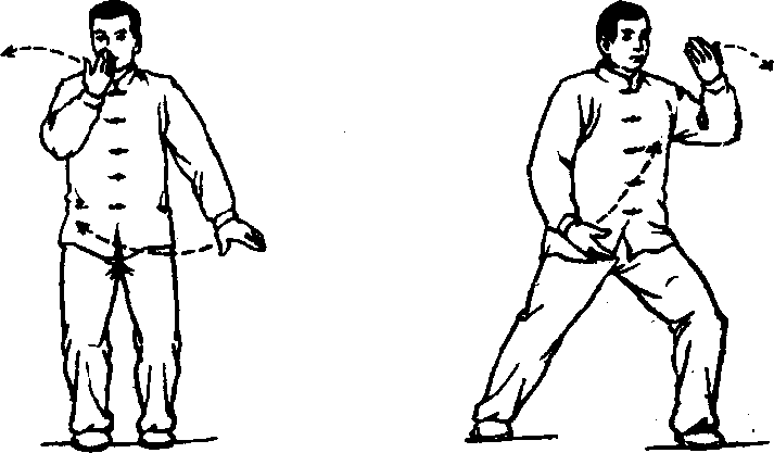 移至左腿}左手由面前随转体向左运转,至身体左侧 手心翻转向左下;右手经腹前向左上划弧至左肩前, 手心斜向后;右脚移近左脚,相距10至20厘米,两 199