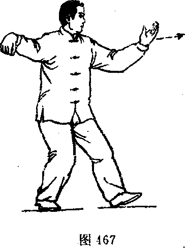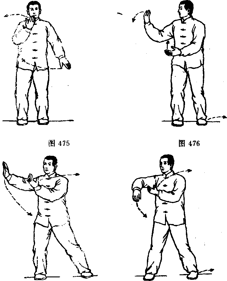 图172图172图473图473经腹前划弧至左肩前,手心斜向后;右脚移近左脚,相 距10至20厘米,脚尖均向前;目视右手(图472至