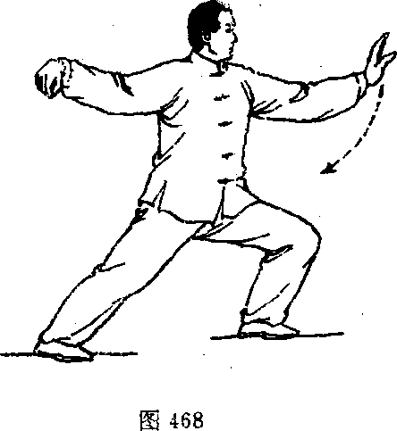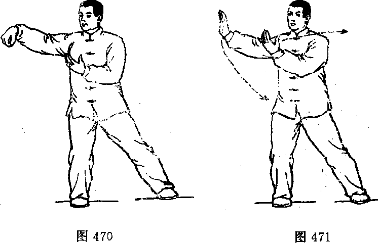 左手经腹部划弧至右肩前, 手心斜向后;右手变掌,手 心向右;目视左手(图470、 471)。