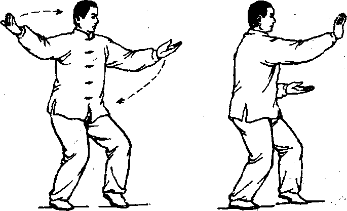 右脚向前跟半步,前脚掌先着地,后全脚踏实,上 体微向右转,重心放在右腿上,左脚跟渐渐离地;右 手由勾手变掌,两手心向上,两肘微屈;目视前?手 (图 500)。图500 图501第二动虚步推掌上体微向左转,左脚略前移,脚尖着地,膝部微 屈,成左虚步;右臂屈肘,右掌经耳旁向前推出,手 心向前,手指高与眼平;左臂屈肘,左手收至左腰前; 手心向上;目视右手(图501)。要点:推掌时上体要正直.,松腰松胯,沉肩坠肘,坐腕、 206展掌、舒指。弓步两脚跟的横向距离不超过10厘米