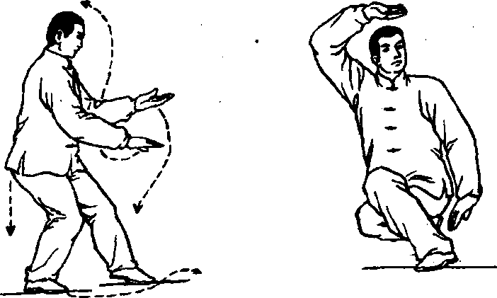 接上动,上体下坐;右脚向左脚前盖步脚踏实,左 腿屈蹲,上体坐在左脚跟上脚掌踏地;右手经体前随上 体下蹲向右向上划弧,附于头顶前上方横掌,手心向前; 左手在右脚跟旁,手心斜向后;目视前方(图503)。