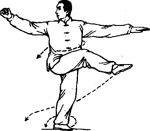 接上动,上体起立;左腿独立稍屈膝脚踏实,身 体重心在左腿;提起右腿向前上踢,脚面微绷;左手 同时向前拍击右脚面;右手握拳随身体起立由上向后