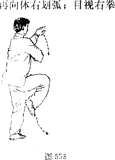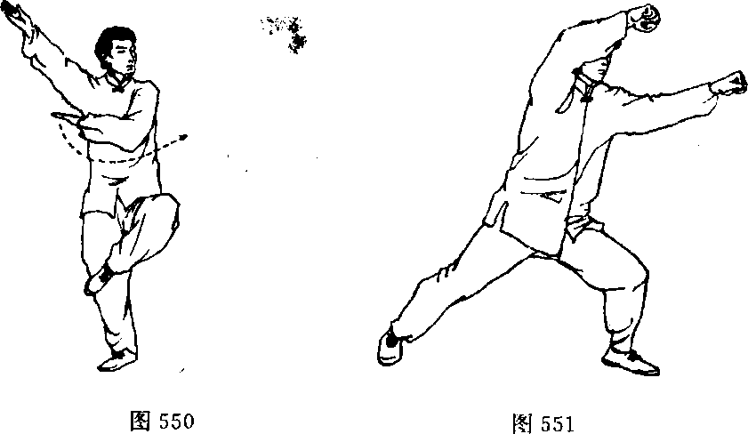 液向上;右拳由右向上附前转腕,反 臂打出,拳心向上,拳而向前;目 115或右拳(图 549)。
