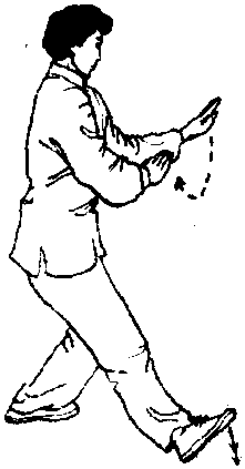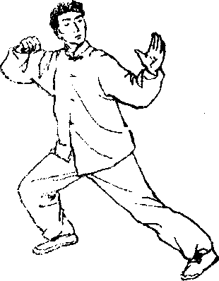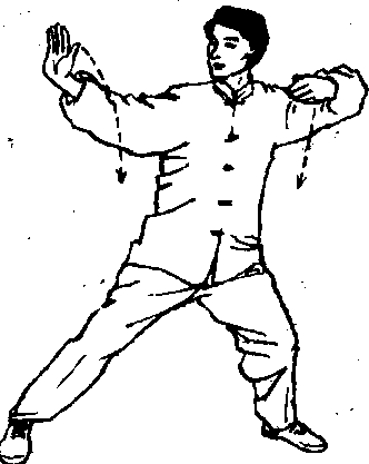 接上动,上体后坐,身体重心渐渐由左腿移至右 腿,左手变掌,虎口向上似向前推弓背:右手松握拳,
