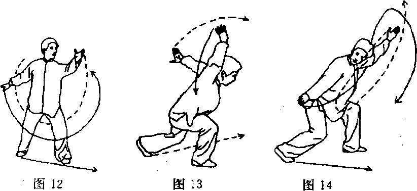 ,①身体微向左转,左脚向左绕步,膝关节弯曲,右脚跟提 起,,膝关节弯曲;同时,右臂内旋下挂,左臂外旋,肘关节微屈 向上置于左斜上方;目视右掌(图14)o