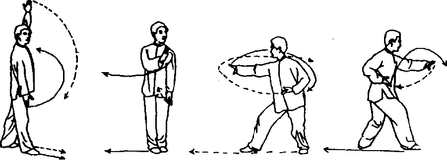 ③右脚向后退步,以脚尖着地成叉步;同时,右掌变尖拳, ? 32 ?