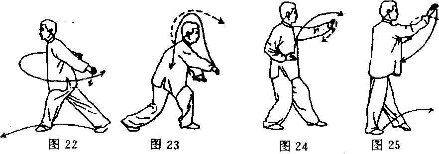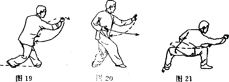 捋手与拦手动作衔接要紧密,回身动作要快。钻拳与探拳必 须要经颁下弧形向前,做到手到步到,上下一致。