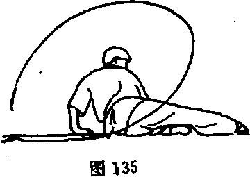 ①左手离地向左后伸,上身立直,同时右手握鞭自后经右向前 在头上方平绕一周后,左手拦握于鞭中部(图136)。