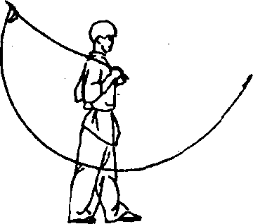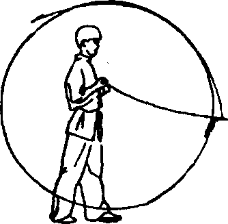 ②左手向左前拨行,使鞭在身体周围绕一平圆后向身下绕扫,