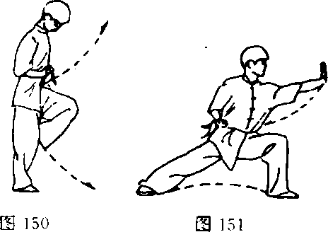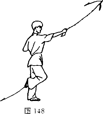 ③鞭继续下绕至前下时,右腿屈膝提起,使脚扣于左膝后部, 鞭继续上绕并随之右手向前上方送出(图148)。
