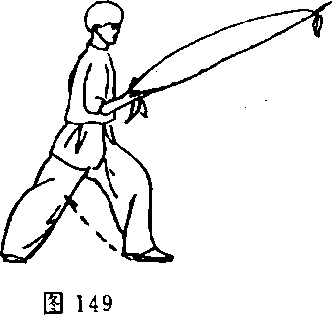 ⑤左腿屈膝提起;同 时,鞭顺势逐节收握于右手 掌内后握紧;目视右手(图 150) o