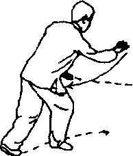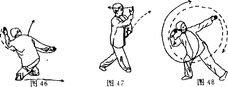 右腿蹬地不可向上纵起,要稍离地面成擦地滑行,两脚要主 动制动,并配合松肩、沉髓和摔掌动作。整个动作衔接要连贯, 上下协调一致。
