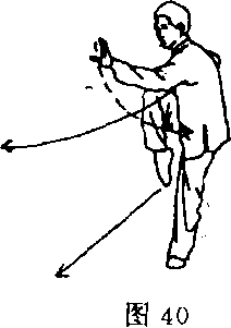 ②身体右转180度,左腿支撑,右 腿提膝;同时右臂肘关节稍弯曲,右掌 随上体的翻转向上、向下反盖屈肘收于 腰间,掌心向上,左掌随上体的翻转, 向上经颈部从右掌上方向前探出,与胸 同高;目视左掌(图40)。