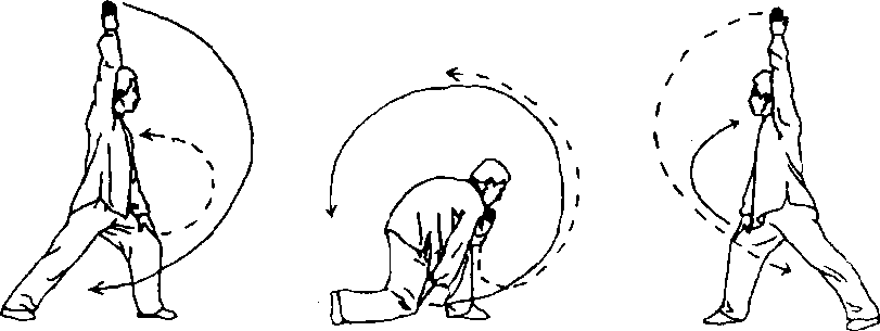 ①身体左转,右腿挺膝蹬直,左脚活步成弓步;同时,左掌 直臂向右、向上抡绕,随转体向下以掌心拍击左腿,右掌经左腋 下向下、向右抡绕,随转体成上举,小拇指侧向前;目视前方