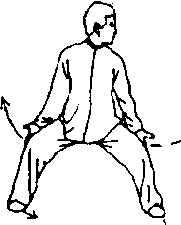 ②右脚蹬地,两脚左移成马步;同时,两掌向两侧以掌背摔 击大腿后部;目视左前方(图54)。