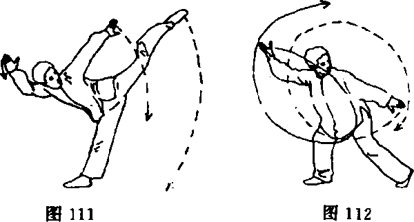 ①左脚下落,以脚前掌着地,膝关节稍屈;同时,右臂借反 弹力自然向前,略高于头,左臂借反弹力自然下落,与腰同高; 目视后方(图112)。
