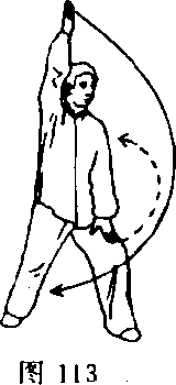 ②身体左转成左弓步;同时,左掌随转体直臂向右、向上绕 一立圆,以掌心拍击左腿,右掌下落经左腋下,直臂向上绕至上 举;目视前方(图113)。