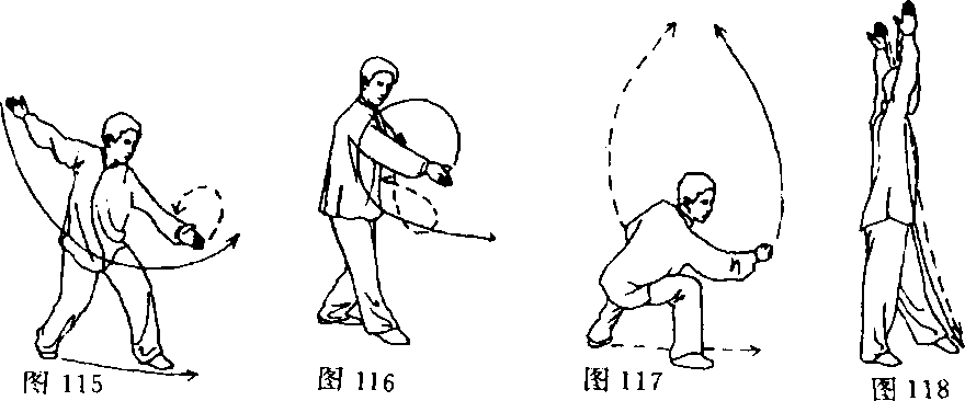 ①身体稍向上立起,右掌直臂向前、向上、向后抡绕与头同 高,左掌下落直臂前挑;目视左掌(图115)。