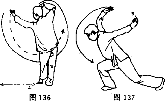 ①身体左转,重心左移成跪步;同时,右臂内旋下挂,左臂 外旋上摆,肘关节稍弯曲;目视右掌(图138)。 ’