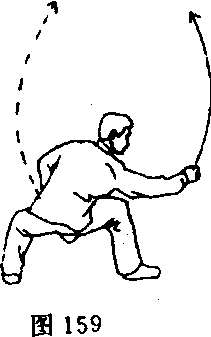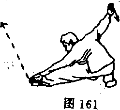 ②身体微向左转,右腿屈膝全蹲, 左腿平铺成仆步;同时,两掌继续向上 成斜上举,再屈肘从头两侧下落,经腋 下沿后腰部向下反穿,左掌不停,沿左 腿外侧继续反穿,右掌继续向下反穿, 随向下仆腿向右置于体侧斜上方;目视 左掌(图161)。