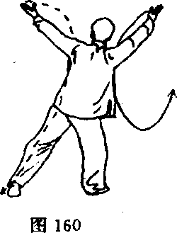 ①重心右移,身体向上立起,右腿膝关节稍屈,左腿伸直以 脚尖点地;同时,右拳变掌,臂外旋向上托起,左掌下落臂外旋 向左、向上托起;目视前方(图160)。