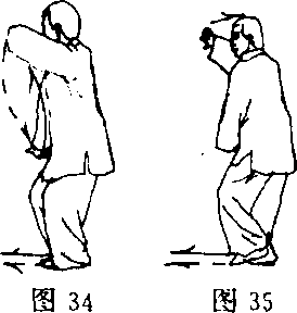 ②上动略停,右脚向右前方进一步,随即左脚跟进停于右脚 内侧,脚尖点地,两腿微屈成左丁虚步;同时,右掌向上经左 胸,左肩前弧形向右运行,至头右上方,右臂内旋使掌心斜向外 停于额前,高与眉平,左掌由左侧弧形下落,臂外旋,掌心向 上,停于右腹前;目视右掌(图35)。
