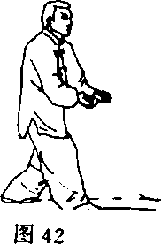②右脚向右前方进一步,左脚随即跟进半步,两腿屈膝成三 体式步;同时,两掌外旋从两侧变拳下落,拳心向上,经腰部向 前下撞击,拳高与腹平;目视前方(图42)。