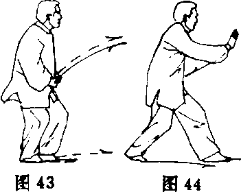 ①右脚前进一步,左脚随之跟进,屈膝收提于右腿内侧成右 摩胫步;同时,双拳收抱于腹前,拳心向上;目视前方(图 43) o