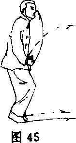 ①左脚向前进半步,右脚随即跟进,屈膝微提于左腿内侧; 同时,两臂外旋,两掌变拳,收于肚脐两侧;拳心向上;目视前 方(图45)