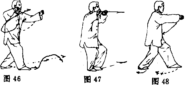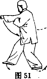 ③右脚前进一步,左脚跟进半步,两腿屈蹲成三体步;同 时,右拳臂内旋向右前下冲出,使拳心斜向下,力达拳面,高与 胸齐,左臂屈肘置于右臂内侧;拳心向下;目视右拳(图51)。
